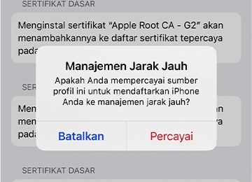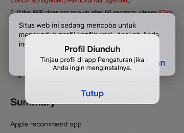 Jika diminta dengan pesan "MDM Payload tidak cocok dengan payload lama". Lalu hapus profil yang ada dengan tap 'Profil yang Ada', lalu tap 'Hapus Manajemen' dan 'Konfirmasi'.
